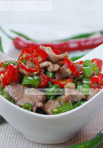 材料:黄牛肉(最好选牛里脊,黄瓜条也行)300克、青尖椒150克、红尖椒150克、蒜2瓣(约10克)、酱油2汤匙(30ml)、淀粉1茶匙(约5克)、小苏打1/2茶匙(约3克)、蚝油2茶匙(10ml)、盐适量、鸡精少量、油