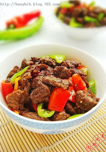 材料:牛肉,青红椒,姜,葱,孜然粉和孜然粒,花椒,料酒,盐,酱油,淀粉,蚝油。