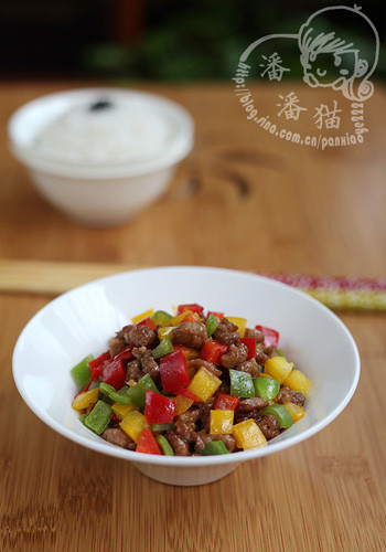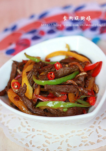 材料:牛里脊100克、各色彩椒各50克、葱末适量、食用油2大勺、淀粉1小勺、酱油1小勺、蚝油1大勺、1小勺料酒