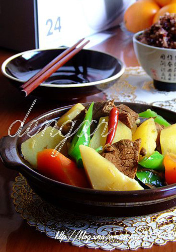 1、牛肉切方块,土豆、胡萝卜和尖椒切滚刀块;